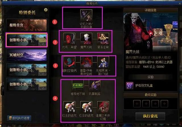 委托任务主要有五大类,它们分别是,根特皇宫、切斯特小镇(一)、切斯特小镇(二)、切斯特小镇(三)、冥域时空。