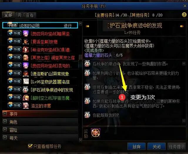 解释一下“定价通关条件”:就是说,这个定价通关条件是任务[战争痕迹中的发现]需要通关魔界大战5次,现在减负为只需通关3次即可。PS:这个任务是在完成了[护石]未知的石头后出现的任务。