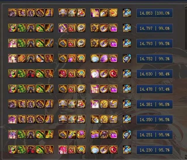(10)狂乱神话:水果3(上衣、肩、腰带)+狂乱3(下装、神话手镯、魔法石)+次元3(鞋子、戒指、耳环)+吞噬2(项链、辅助装备)