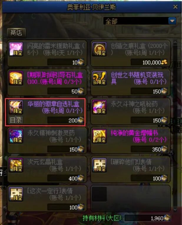 另外,巨龙C可以在奥菲利亚商店,每周兑换一个华丽徽章自选,推荐优先选择蓝色三攻,次选红色力量/智力徽章,最后选绿色暴击徽章。