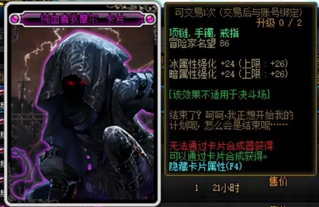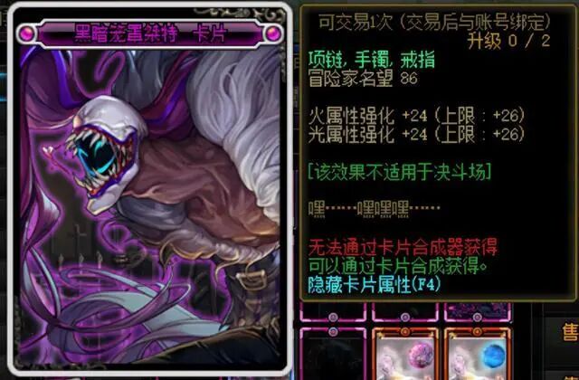 首饰方面,可根据自己的职业,选择纯血者狄摩尔或者黑暗笼罩桀特两张卡片,这两张卡片最高可到26点属强,是所有卡片中性价比最高的一个。
