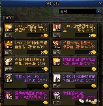 100级传说装备有黑暗幽灵和鲜红血纹两种,同套装有2/3/5套装属性。除了在“记忆之地”和“无底坑道”副本(简称3+3)中掉落外,还可通过NPC管理校将杜罗西/冒险团商店兑换、任务奖励(角色2个,周期2天),如果经济允许还可以通过拍卖行购买或者礼遇特权租赁。