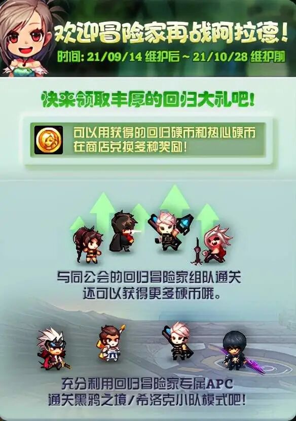 专门为回归玩家准备的活动,由普通的回归玩家,变成回归大爷。活动一出,回归玩家在地下城中待遇如日中天,香饽饽一样。与回归大爷组队不仅可以享受回归大爷带来的专属BUFF(四维+200、1~50级技能+1、移速+10%)加成,而且还能得兑换豪华奖励的材料。勇士回归,重振8000W勇士指日可待,下一个会是你吗?