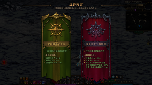 进入副本后,我们要从两个阵营中选1个来进行接下来的游戏。笔者推荐选择右边的雷米迪亚支部座堂,属性加成为,技能攻击力+80%,技能大小+30%,每存在1个冷却中的技能,所有技能冷却速度+20%,三速+10%。