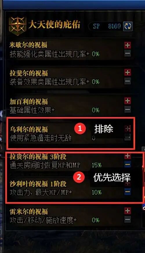 满足解锁条件和6万点难度后,为了更好地通关强化后的命运抉择副本,这里有必要对[大天使的庇佑]栏也进行一翻加点,还是和副本中选择特殊能力一样,优先选择提升生存能力的BUFF,这里排除紧急遁走时无敌的BUFF选项,因为在[七大原罪]栏里我们加了“懒惰”的点数(不能使用紧急遁走)。