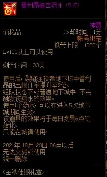 普利昂追击药水只能在在裂缝注视者副本中使用,可把普利昂出现的几率再提升2倍;组队状态下,该药水不会生效。并且在使用之后,当天没有及时触发效果,那么隔天凌晨6点就会刷新。