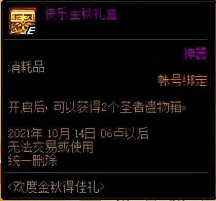 7日签到奖励:从10月1号开始到10月7号期间,玩家每天可获得1个金秋欢度礼盒,从礼盒中选择50点疲劳药或者2个装备提升礼盒。很遗憾,只能选1种道具。