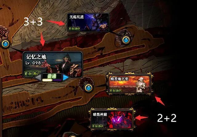 每日2+2指痛苦地下室、暗黑神殿副本,每日3+3则是记忆之地和无底坑道副本。这四个副本是百级版本中过渡型装备——百级传说与工作服的主要相关副本。由于前者每日每图仅能获取3次特殊奖励,后者仅能获取两次特殊奖励而得此简称。