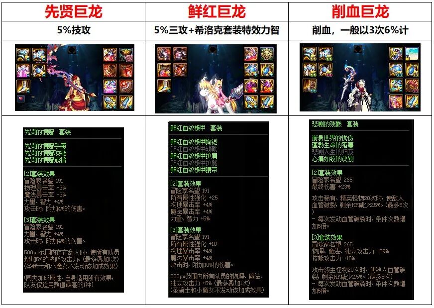 说到巨龙的搭配,巨龙在装备上大致分为3种,先贤巨龙、鲜红巨龙以及削血巨龙。