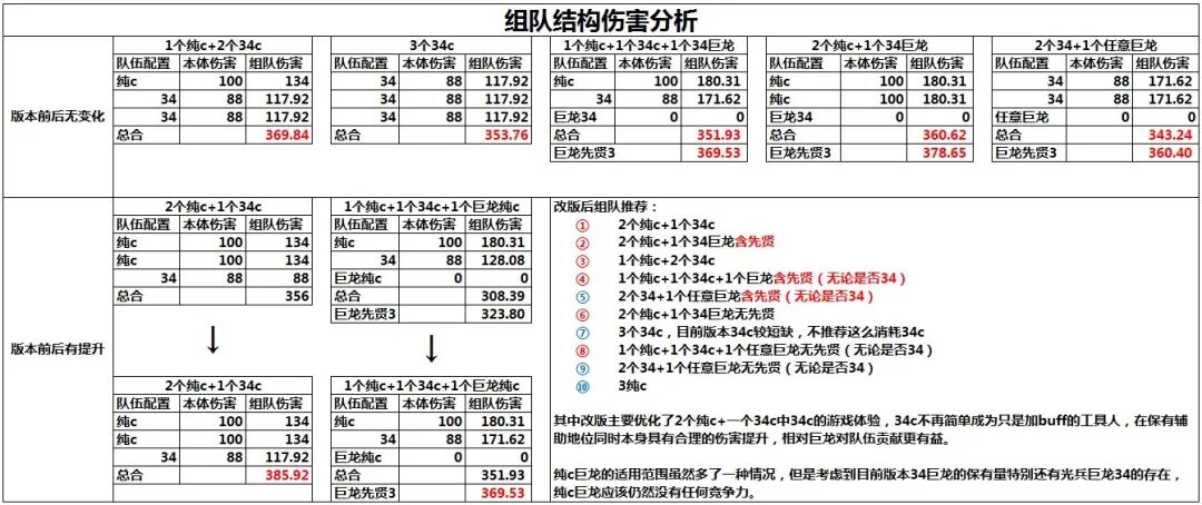 上表可知,其实改版后影响最大的配置应该还是2纯c和1协同的配置,毕竟尤其在国服34c已经被普遍当成工具人,虽然巨龙出现后稍微改善了上层34c的体验,但这也伴随着剥夺低名望、低打造的34的进图位置。改版之后,即使是单34的情况,同打造的情况下34的伤害也足以与纯c比足。改版之后,2纯c1协同的配置成功跃上组队数据最高的配置,大家以后可以不用再担心单人34吃不到自己倍率的问题。