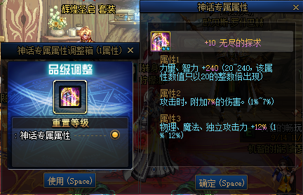 正确的做法应该是优先把数值区间高的词条拉满,再用神话调整箱调剩1个数据区间小的词条。以大幽魂手镯为例,先把力智词条和三攻词条拉满,这样再用神话调整1%~7%的白字词条就很好调了,由于白字数值区间小,只有1%~7%,因此相对于数值区间大的20~240力智、1%~12%的三攻词条更容易调满一些。