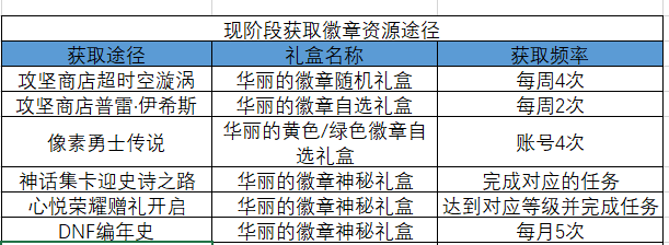作为DNF一大特色,徽章对于角色伤害提升也是有巨大帮助的,但是获取徽章主要靠分解装扮,这样的话代价就比较大了,所以笔者将除了分解时装外的主要获取途径如下表所示: