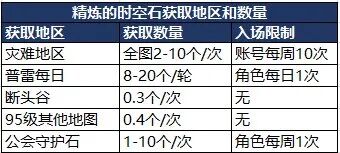 下面列举一些精炼的时空石和时空石的获取地区和数量。