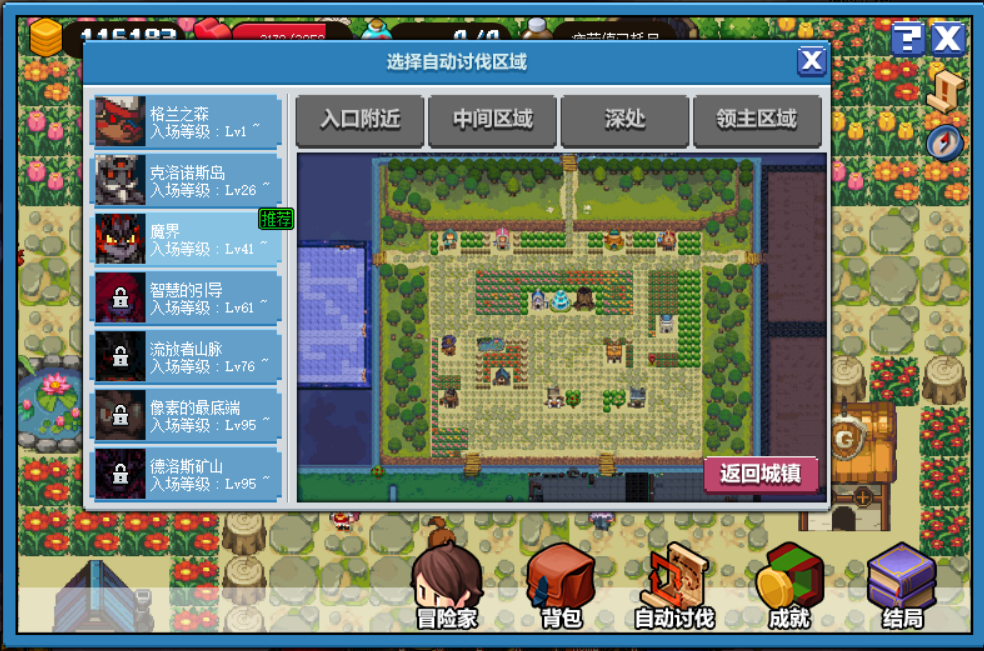 提升战斗力必不可少的领主区域需要特别留意,击败领主怪物会掉落史诗级装备与建筑升级的必须材料,所以每日的领主区域不要忘记手动讨伐。