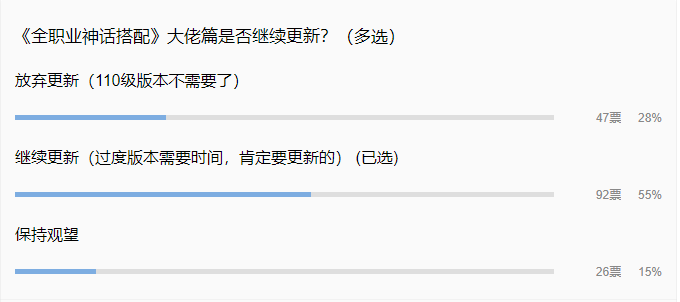 关于《全职业神话搭配》大佬篇是否继续更新,小伙伴们也是积极参与了此次的投票,笔者甚是欣慰。投票结果以92票支持《全职业神话》继续更新,在此,也有小伙伴留言:期待让笔者在本期更新【魔道】的大佬神话搭配,那笔者肯定不会让你失望,只要你留言,必安排!