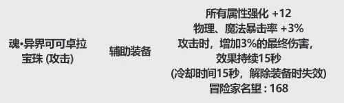 2019年:属强+12 暴击+3% 3%最终(持续/CD均10s)2020年:属强+12 暴击+3% 3%最终(持续/CD均15s)2021年:属强+12 暴击+3% 3%最终(持续/CD均15s)2022年:属强+12 暴击+3% 3%最终(持续/CD均15s)对比此前的变化:毫无变化评价:C系必不可缺!且其下位替代品漩涡卡片因不明原因现无产出,毫无性价比可言。