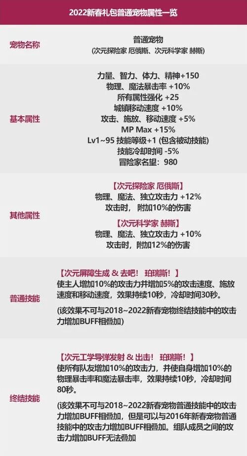 2019骑士莱恩/吟游诗人薇泽达:12%白字 1-50技能+12020弓手维多利亚/神官格洛丽亚:12%白字+10%力智(总和22%) 1-50技能+12021骑士蕾切尔/精灵使璘:12%三攻+10%白字(总和22%) 1-80技能+12022次元探险家厄俄斯/次元科学家赫斯:12%三攻+10%白字/10%三攻+12%白字(总和22%) 1-95技能+1对比此前的变化:85-95技能+1评价:C系酌情更换。奶系量力而行,可参考文末赫然在心的文章。1级二觉主动的提升率不上不下,1级95主动+被动的提升率还不错。从2016到2019年,白字词条经历了5%→8%→10%→12%的稳定提升,中规中矩。2019-2020,可能是为了配合100级版本的到来,想为了业绩做点大动作,于是词条数值总和突然提升了10%,让人有些猝不及防。2020-2021,可能是考虑到原先的等级区间设置与版本脱节,于是提升了等级加成的区间,几个重要主动技能以及二觉被动对C系的提升不容小觑。但是,2021年耕耘礼包新出的宠物加入了奶系词条,又一次恶心了所有奶系玩家,相关宠物基本覆盖了新春宠物的属性,但又没有做到完美覆盖,不追求极限的情况下单个耕耘宠物即可满足奶系的需求,追求极限的情况下新春宠物的二觉被动等带来的太阳数据又微乎其微高了一点,这就为奶系角色对于2022年新春宠物的取舍带来了困难。奶系角色配置新春宠物需要量力而行,下次的耕耘宠物是否会提升等级区间很难预判。