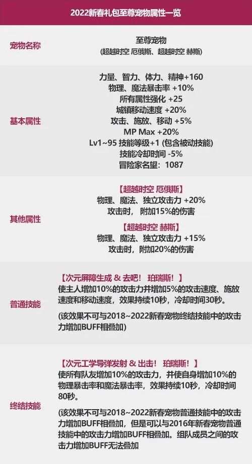 2019古国英豪莱恩/太初之音薇泽达(单账号数量限2):15%白字+5%最终(总和20%) 1-50技能+12019进化 神迹·古国英豪莱恩 / 神迹·太初之音薇泽达 (限2):15%白字+5%最终+8%力智(总和28%) 1-50技能+12020雷光之箭维多利亚/暴风圣女格洛丽亚(单账号数量限3):15%白字+5%最终+12%力智(总和32%) 1-50技能+12021火神的化身 蕾切尔/火神的化身 璘(单账号数量限3):12%力智+20%暴伤(总和32%) 1-80技能+12022超越时空 厄俄斯/超越时空 赫斯(单账号数量限3):20%三攻+15%白字/15%三攻+20%白字(总和35%) 1-95技能+1对比此前的变化:词条数值+3% 85-95技能+1评价:C系建议更换!基本可以确定为2022新春礼包中最高的提升率。至尊宠物是双尊和普通拉开差距最大的地方,大有一发不可收拾的趋势。配合普通宠物在2019-2020的大跨度加强,至尊宠物更是把词条数值提升放大到了12%,2020-2021的等级区间提升与普通宠物保持一致,中规中矩。正常情况下毫无疑问选择配置给C系角色,奶系角色完全不需要考虑。