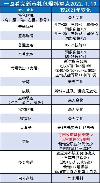 2019新春:7%白字2019耕耘:四维+332020新春:8%白字2020夏日:7%黄字/7%力智/四维+332021新春:8%三攻/四维+332021夏日:8%力智/8%最终/四维+33 属抗+102022新春:8%三攻/四维+33评价:必备!无需更换。对于C系职业,2020年将词条数值提升至8%,2021新春礼包和夏日礼包在数值不变的情况下又开放了三种伤害词条类型,可选项增加。值得一提的是,2021夏日首次在红色栏位增加了属抗属性,大幽魂系列装备的玩家在不损失伤害的前提下,堆暗抗的方式进一步增加。对于奶系职业,2019耕耘礼包首次加入了四维+33的选项,超越了此前的圣光之眸(智体精+25,极限的祭坛)和红色卡牌(体精+25,2017魔性卡牌对对翻活动),此后的海底秘宝红水晶(体精+25,2019夏日海底大寻宝活动)和烈阳红宝石(四维+25,每周地下城,常驻)也比不上它的属性。时隔一年多,该属性红色宠装终于常驻于新春礼包和夏日礼包,使奶系玩家不再为获取渠道苦恼。老玩家建议保留往期道具。