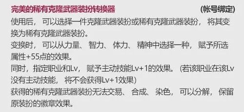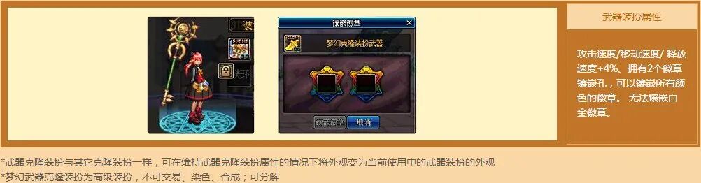 带有彩色徽章镶嵌栏×2的梦幻克隆武器装扮首发于2019年的金秋礼包,此后在金秋和新春礼包中持续稳定供应。此前的武器装扮三速属性对伤害/奶量基本无用,不纳入讨论。普通梦幻克隆自带:彩色徽章镶嵌栏×2稀有品级增加属性:①力/智/体/精+55 ②40/45/60/70/75/80级主动技能等级+1中的1项评价:值得更换,量力而行。需要注意的是女气功的40加成是丸子,男气功的75加成是雷切,元素的75加成是大水晶,召唤的60加成是海伊伦,审判的80加成是神罚之锤,外传职业看这里(均以国服正式服为准)。以C系职业的伤害角度来看,当前最优解为蓝色+20攻击玲珑徽章,值得一提的是时装页的武器装扮、光环、皮肤均不可使用卡妮娜商店的徽章升级券,故建议灿烂徽章溢出前完全不考虑,最好一步到位直接使用玲珑徽章,过渡可使用华丽徽章。当然有些情况下也可以考虑使用带有暴击/属抗的徽章,以满足特定需求,推荐优先级较低,更推荐在红色孔位补足暴击,红色/黄色孔位补足属抗。奶系职业毫无疑问当前最优解为红色+35智力/体力玲珑徽章。