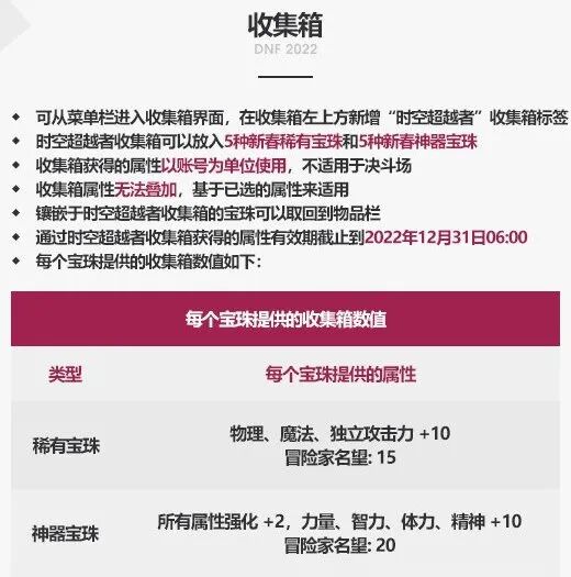 2019新春:9种稀有宝珠,收集箱满属性为【物/魔攻+72 独立+108】注:宝珠可交易不限次。收集箱属性仅对角色生效,属性有效期到同年12月31日。2019耕耘:①5种稀有卡片,收集箱满属性为【四维+50】2019耕耘:②5种神器卡片,收集箱满属性为【属强+10】注:【稀有卡片自选礼盒】/【神器卡片自选礼盒】为限制1次交易道具,卡片账绑。收集箱属性仅对角色生效,属性有效期到同年12月31日。2020新春:9种稀有宝珠,收集箱满属性为【三攻+108】注:宝珠可交易不限次。收集箱属性仅对角色生效,属性有效期到同年12月31日。2020耕耘:①5种稀有宝珠,收集箱满属性为【四维+50】2020耕耘:②5种神器宝珠,收集箱满属性为【属强+10 属抗+10】注:【稀有宝珠自选礼盒】/【神器宝珠自选礼盒】为限制1次交易道具,【神器宝珠神秘礼盒】为账绑,宝珠账绑。收集箱属性仅对角色生效,属性有效期到同年12月31日。2021新春:①5种稀有宝珠,收集箱满属性为【三攻+50】2021新春:②5种神器宝珠,收集箱满属性为【四维+50 属强+10】注:【宝珠神秘礼盒】为账绑;开启随机获得【稀有宝珠自选礼盒】(概率90%)/【神器宝珠自选礼盒】(概率10%),为限制1次交易道具;宝珠账绑。收集箱属性对账号生效,属性有效期到同年12月31日。2021夏日:①5种稀有宝珠,收集箱满属性为【三攻+25】2021夏日:②5种神器宝珠,收集箱满属性为【四维+25 属强+5】注:【宝珠自选礼盒】为限制1次交易道具,宝珠账绑。收集箱属性对账号生效,属性有效期到次年6月30日,与新春冲突,需自选其一生效。2022新春:①5种稀有宝珠,收集箱满属性为【三攻+50】2022新春:②5种神器宝珠,收集箱满属性为【四维+50 属强+10】注:未提及概率,猜测无变化。评价:必备!2019耕耘首次推出了同年度第二套收集箱的设定,同时带来了对奶系职业的提升,但一年要买至少二套的设定收获的差评极多。2021年则整合了相关属性,同时调整为账号适用,绝对是良心改动。而2021夏日推出的五折属性收集箱作为新春收集箱的下位替代品,不会对购置了新春收集箱的玩家带来额外负担,同时也为没赶上新春的玩家提供了备选方案。需要注意的是,虽然新春收集箱有20天左右的真空期,但为了填补这一真空期额外购置夏日收集箱属实没有必要。