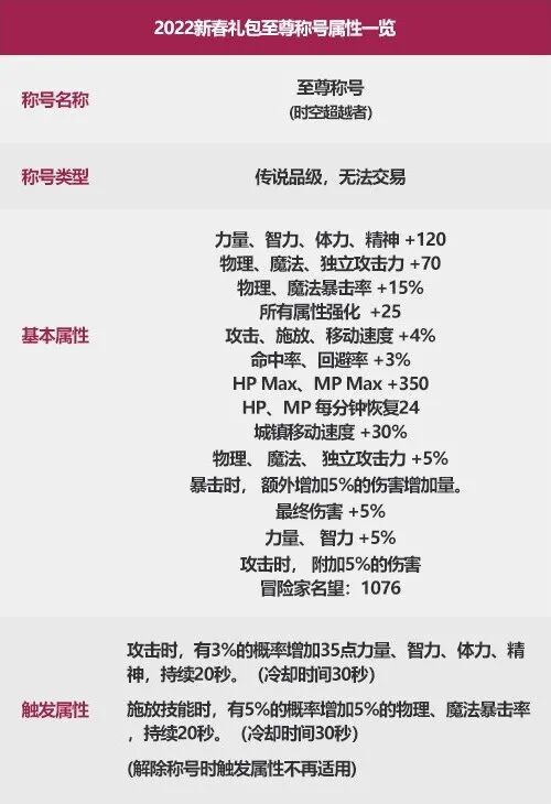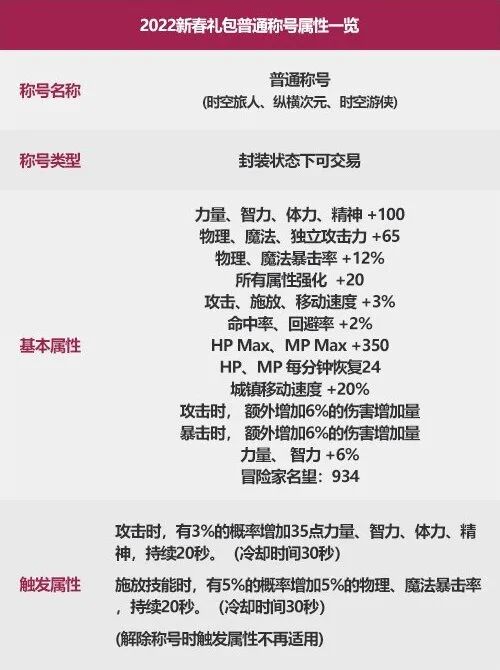 2019年:属强+15 物/魔攻+30 独立+40 1-50主动技能+12020年:属强+15 三攻+40 1-50主动技能+12021年:①属强+15 三攻+40 1-50主动技能+12021年:②属强+15 三攻+40 3%技攻2022年:①属强+15 三攻+40 1-50主动技能+12022年:②属强+15 三攻+40 3%技攻对比此前的变化:毫无变化评价:C系必不可缺!仅在至尊称号情况下需要使用自己的礼包内宝珠,非至尊称号角色/少号党少礼包情况下建议直接拍卖行购买带宝珠的称号,新春礼包在售期间价格极低。多余宝珠如非急需回血,技能等级宝珠可以等待耕耘礼包普通称号来临,也可以和技攻宝珠一样直接打在新春输出称号上,如无经济压力,推荐周年庆至国庆再出手。奶系评价详见下文称号部分。