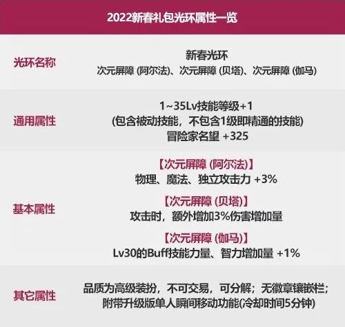 2019年:四维+20 属强+5 1-20技能+12020年:四维+20 属强+5 1-20技能+12021年:3%黄字/3%暴伤/3%三攻/1%奶系buff力智 1-35技能+12022年:3%三攻/3%黄字/1%奶系buff力智 1-35技能+1对比此前的变化:毫无变化评价:按需自取,可以分解。账绑道具,阉割了交易和回收的选项,令人作呕。光环部位的毕业级选择向来放在金秋礼包内提供。而新春礼包内的光环,并没有彩色徽章镶嵌栏,即使2021年加入了伤害词条/奶系词条,属性仍然较为一般,无论是C系还是奶系,一般仅作为过渡使用,或为小号提供buff强化等级(区间已覆盖全职业)。