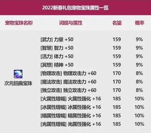 2019新春:火/冰/暗/光属强+16或力/智/体/精+502020新春:火/冰/暗/光属强+16或力/智/体/精+502021新春:火/冰/暗/光属强+16或力/智/体/精+502021耕耘:火/冰/暗/光属强+16或力/智/体/精+502022新春:火/冰/暗/光属强+16或力/智/体/精+50评价:必备!数值已维持四年无变化。值得一提的是2021耕耘首次加入奶宠的同时也提供了可交易的附魔宝珠,对于想省钱的C系玩家,可以考虑等到耕耘礼包上架再购买属强宝珠;奶系玩家则没有操作空间。
