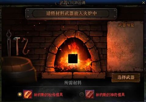 如图,将自己想要幻化的武器放入格子后,消耗该武器和对应的模具即可生成幻化道具林纳斯的秘传模具和神奇模具可以在商城购买