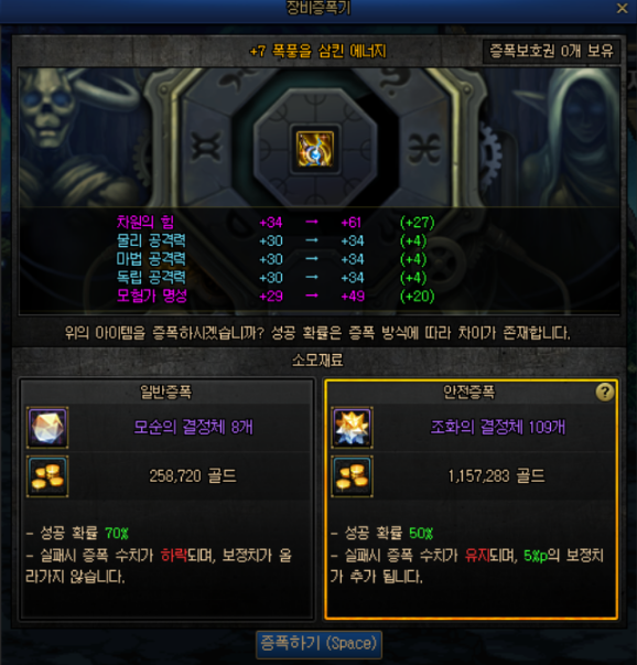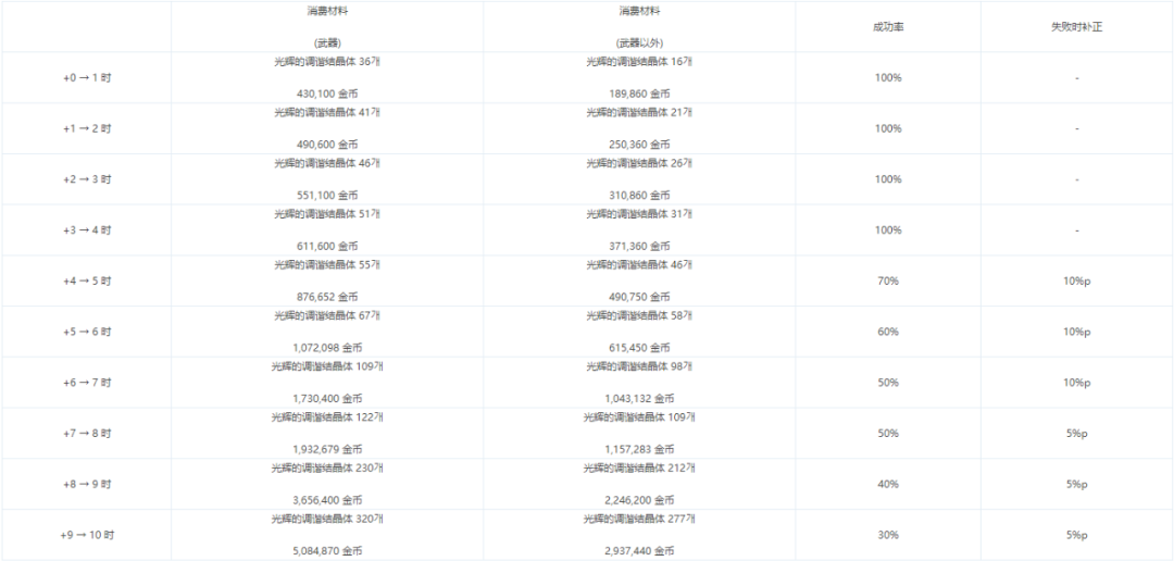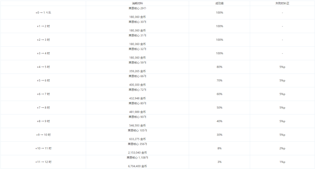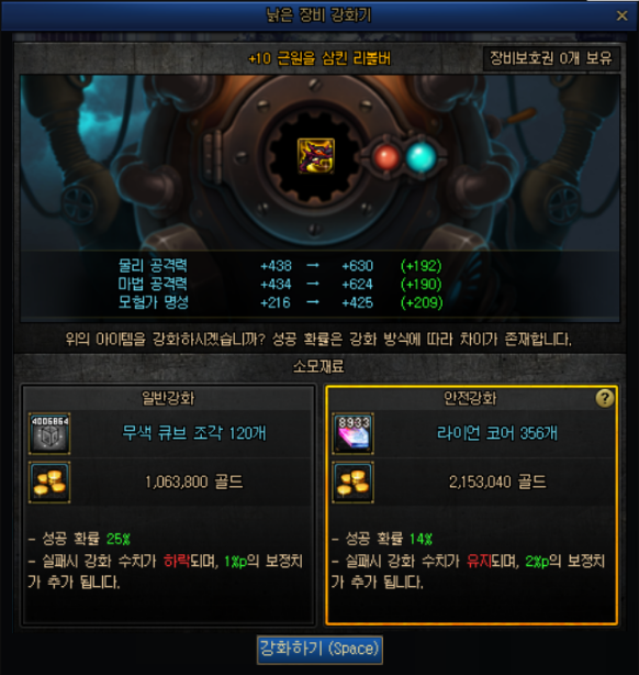 安全强化 * NPC 凯莉处新增【安全强化】功能. - 安全强化模式下,即使强化失败也不会减少强化数值,且能累积适用于下一次的成功补正率。 - 使用新材料【莱恩核心】来进行安全强化. ㄴ莱恩核心可在新地城中获取. - 一次化器、公开强化、时空石强化机不适用安全强化。 * 仅当装备满足以下所有条件时,才可使用安全强化. - 武器道具 - 装备等级100以上 - 神器以上品级 - +11 以下强化 * 安全强化的成功几率与消费/补正值规则如下. - 普通强化所对应的,提升强化成功率的道具、消耗品不适用于安全强化. - 安全强化与普通强化所累积的补正值互相独立. - 强化成功时,该阶段所累积的强化补正值会被重置. - 各个强化阶段信息如下. * 删除普通强化中作为强调的边框效果. 安全增幅 * NPC 克伦特处新增【安全增幅】功能. - 安全增幅模式下,即使增幅失败也不会减少增幅数值,且能累积适用于下一次的成功补正率。 - 使用新材料【光辉的调谐结晶体】来进行安全强化. ㄴ莱恩核心可在新地城中获取. - 一次性增幅器等特殊增幅途径不适用安全增幅。 * 仅当装备满足以下所有条件时,才可使用安全增幅. - 装备等级100以上 - 神器以上品级 - +9 以下增幅 * 安全增幅的成功几率与消费/补正值规则如下. - 安全增幅与普通增幅所累积的补正值互相独立. - 增幅成功时,该阶段所累积的增幅补正值会被重置. - 各个增幅阶段信息如下. |