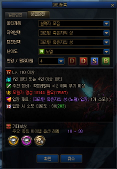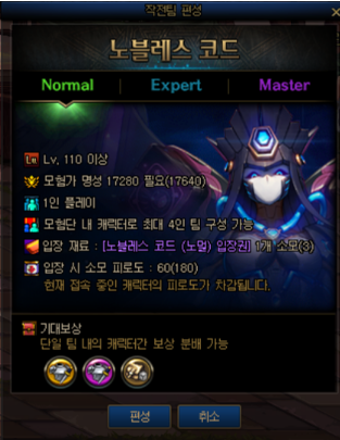 概要 * 添加贵族代码地城. 地城 信息 * 地城 入场等级: 110 *每日入场限制 : 无 *疲劳值 : 固定消费60点疲劳值 *组队状况 : 无法组队 *名望值限制:进入地城时需要一定以上的名望值.