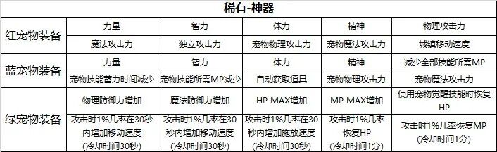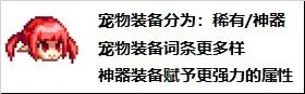 新式宠物装备分为稀有与神器2种,神器宠物装备相较于稀有可以赋予神器专属的词条。
