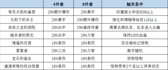 为了小伙伴们看着方便快捷,笔者将8套巨龙套的增伤词条和触发条件汇总成了一个表格,由于8套巨龙套的11件套属性都不提升增伤词条倍率,所以并不讨论11件套属性哦。