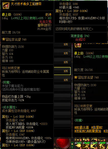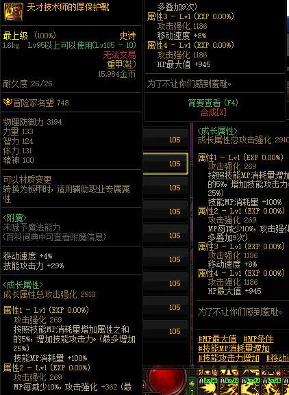 110版本删除了套装属性,除了技能攻击力之外的伤害词条也被取消。105级史诗装备只存在技能攻击力以及攻击强化两个词条。(原来的装备词条并未整合,只是新装备无其他词条)