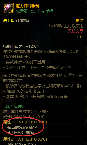 其实MP流更是有两个分支,主要看小伙伴们是否装备了“魔力抑制手镯”,该手镯属性1可以让小伙伴被击时用减少MP来抵消减少HP,也就是小伙伴们MP掉到0之前是不会死亡的。
