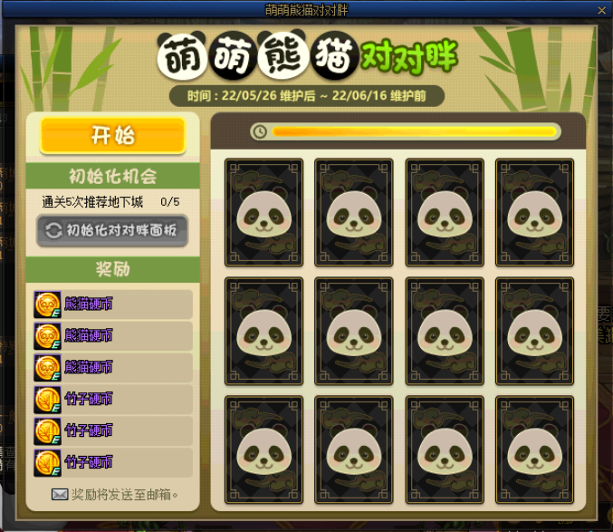 上线即可获得一次挑战翻牌机会,30秒内进行翻牌,每翻到两张相同的卡片时,视为成功1次。通关5次推荐地下城可初始化翻翻乐面板,重新挑战。根据时限内,翻牌配对成功的数量获得活动材料,活动材料有熊猫币、竹子币两种,可分别在NPC胖萌熊猫侠的熊猫商店、竹子商店兑换奖励。