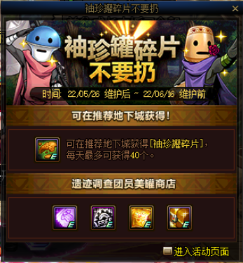 通关推荐地下城可获得活动材料,材料在活动NPC美罐商店兑换奖励。