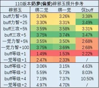 计算模板:奶全身105ss,不带神话,CP武器;8500适用,80000buff量;满特色(35级buff,38级一觉,不算玉4.5%buff量),无3Sc模板25000力智(含系统奶),3450三攻(一觉等级+2即到满级40级,再往上会溢出,因此最多只计算了+2的玉)