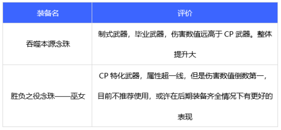【结论】:巫女的缺点一直是基础低,而这次2把武器的伤害数值还是一如既往的低,在这个需要堆积伤害数值的110版本,还是更推荐制式武器,CP武器虽然属性超一线,但是倒数第一的伤害数值拉低了这把武器的表现,还有令人诟病的属性模式,使得CP武器地位变得非常尴尬。也许在后期装备词条都满级的情况这把武器有更好的发挥空间(个人看法CP武器做的很垃圾,想提高巫女的操作,但是触发条件确实睿智),但是目前来说弱的可怜。