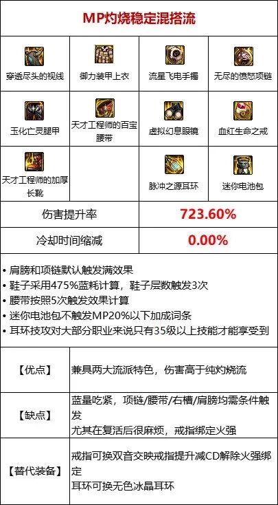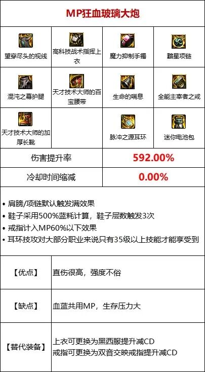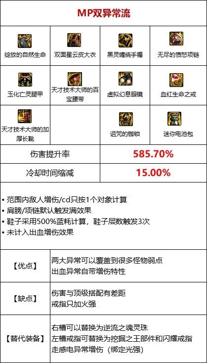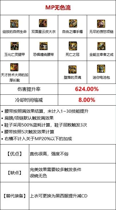 利用核心装备[MP消耗量增加]与[技能攻击力增加]挂钩的特性,堆高[MP消耗量增加]词条,由于带有[MP消耗量增加]的装备本身也有类似与MP消耗挂钩的属性,合理搭配可以带来很强大的提升加之MP过载装备在部位方面与其他流派不冲突,也可轻松混搭【流派优点】①高额的伤害加成,且都为直接伤害,不需要结算时间②部位友好,可其他流派无缝混搭【流派缺点】①MP消耗量过大,需要有足够的MP药②如果副本限制消耗品将会严重影响手感 ③MP流派的大部分装备发挥全部提升均需要一定触发时间,所以需要避免阵亡以及见面交大招
