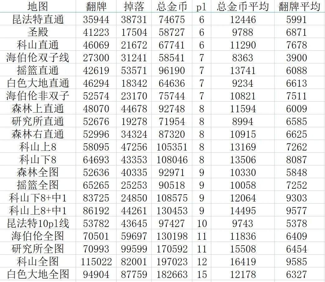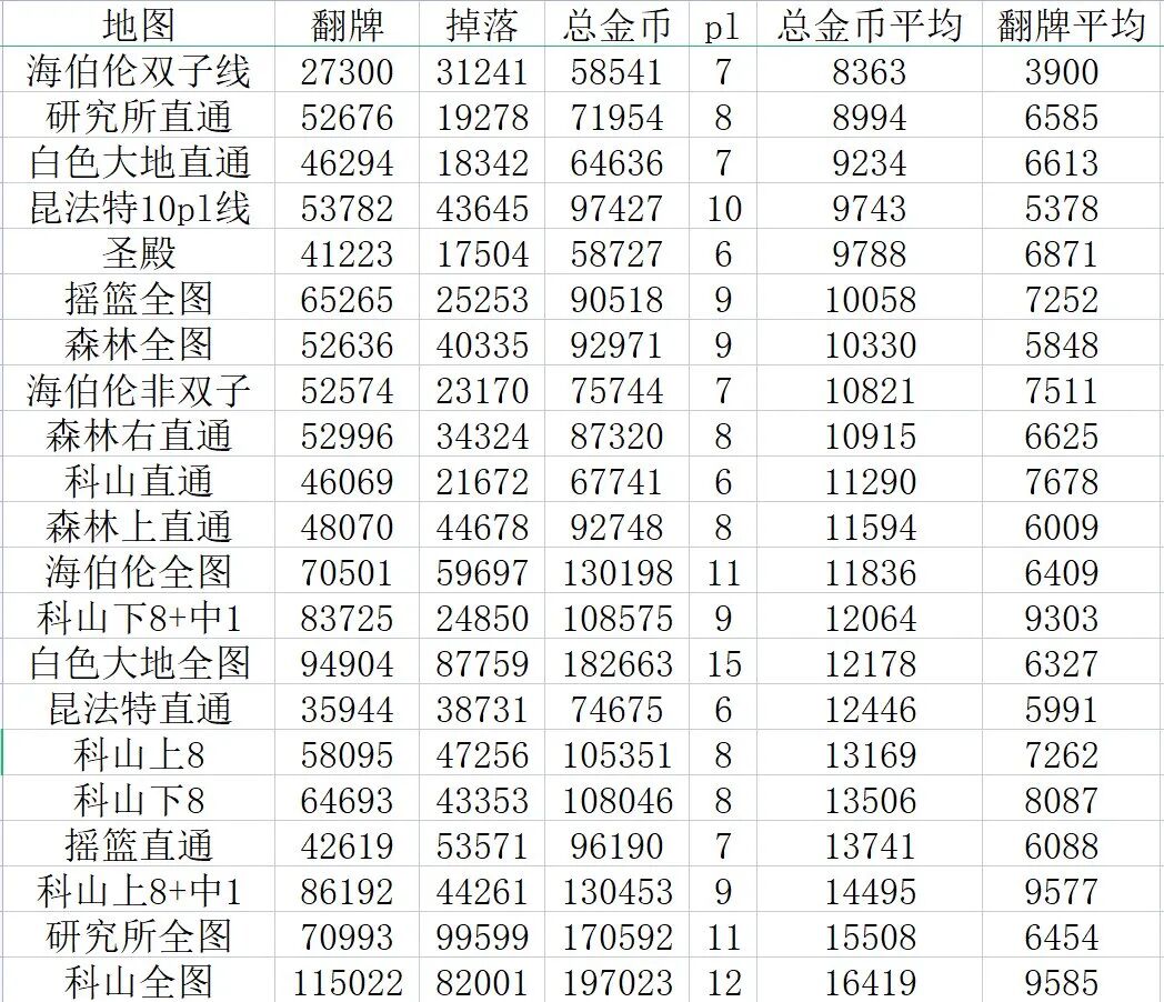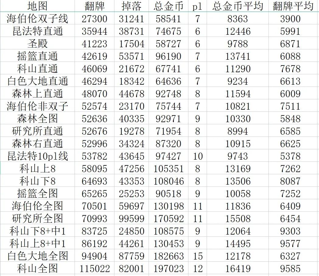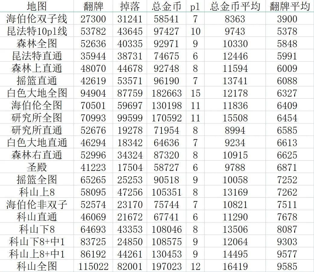 编辑:科山直通掉落有浮动,已更正新增摇篮全图和科山上8+中1以及下8+中1数据说明:所有地图收益均为1-2次测试,2次排除浮动情况的影响,所以不能完全确定是这个值,只是可以确定大概的范围,大部分浮动值在1w-2w左右,科山上8的翻牌金币经验证后发现属于偏向最低的值,正常翻牌和下8差不多,在6w-7w之间其次,由于掉落金币浮动过大,所以部分地图收益和别人测试的不一定一样,以你自己的为准,本帖测试存在明显浮动的分别是科山直通,研究所直通因为采取的是单次和2次数据,所以对掉落金币的测试并不准确,实际掉落需要全疲劳测试取平均,所以这里掉落测试只作为参考不作为结论总结一下搬砖姿势就是:每日4图+科山全图每日4图+上8科山9图+2次科山全图(13pl以上)按翻牌排序:
