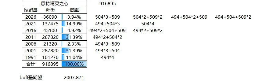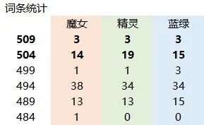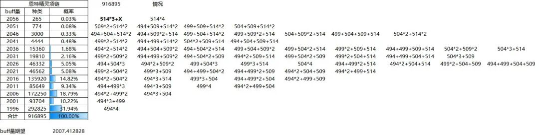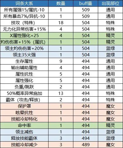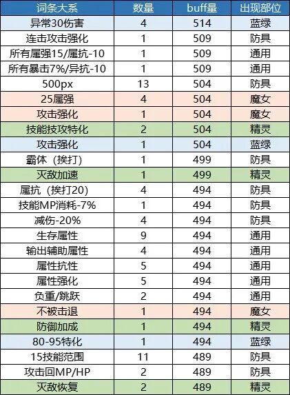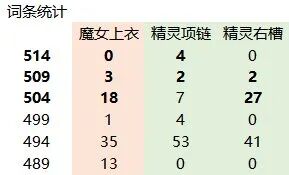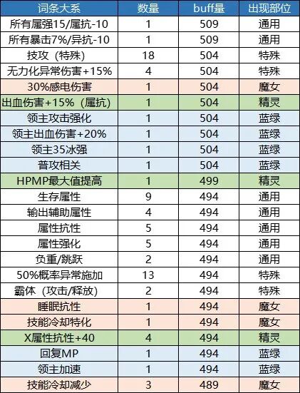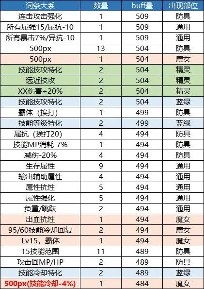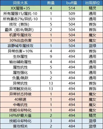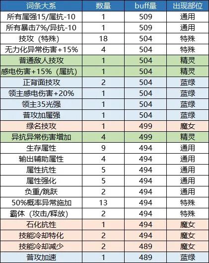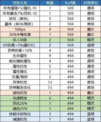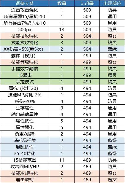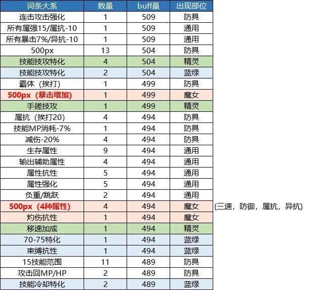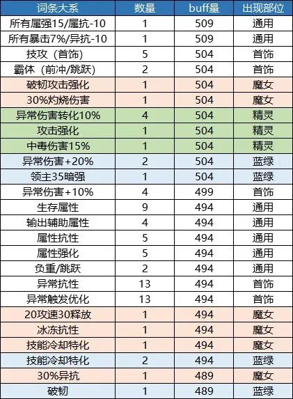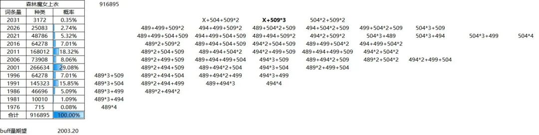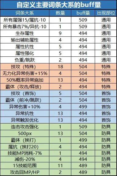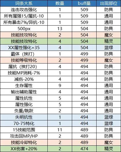 本章仅供展示,列举出了11个部位的所有词条和他们对应的buff量,同时对各档位的词条数量进行了一个统计。1.上衣