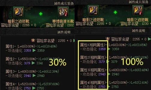 一般而言,不同属性的词条仅可继承材料装备30%的经验,相同属性的词条可继承材料装备100%的经验。