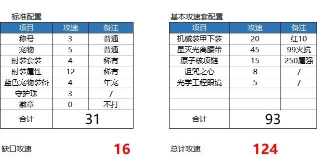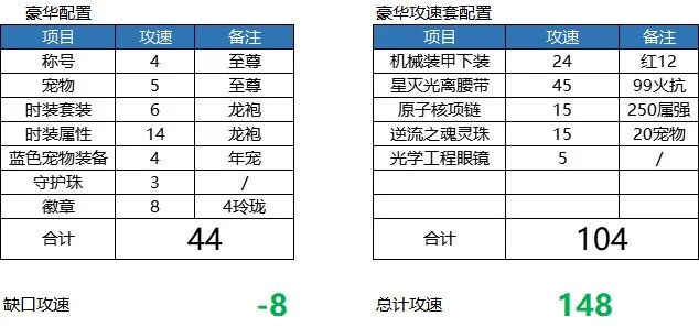 攻击速度如果走攻速鞋体系,就不得不考虑攻速的搭配。由于必须是装备提供的攻速,因此不能靠职业的buff和吃超速等方法讨巧。下表列出了标准配置和豪华配置下的国服攻速提供情况: