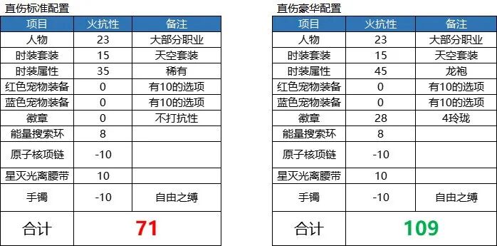 红色年宠装备带抗性可以追溯到去年夏日~今年年套,期间由于红色宠物装备一直是8%的词条,故国服存在大量的角色因为觉得没有提升而没有更换,也就没有这部分的抗性加成,属于历史原因。从列出的一些通用的项目来看,达到99其实不难。有徽章这个不错的补足手段。在4个玲珑徽章的情况下就可以补28点火抗,满足71+28=99的要求了。抗性徽章是彩色的,可以在黄、绿两个对人物面板影响比较小的位置优先替换。更换抗性徽章还可能为某些词条如250抗性的15%出血伤害做准备。为了弥补缺憾,除了尽可能避免带【-10所有属性抗性】词条的装备(代表的有无色手镯,对直伤不利)之外,还有方法就是靠消耗品解决。卡妮娜NPC处就有出售价廉物美的火符咒,还有以前开盒子留下的紧急恢复药等手段。