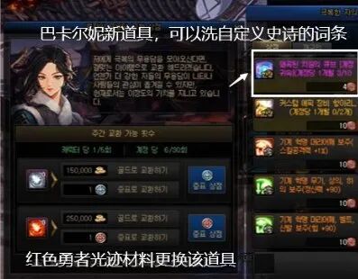在不远的未来版本,巴卡尔妮上线后,也可以在攻坚商店用多余的团本材料换取自定义史诗随机罐。新的红色勇者光迹材料可以购买自定义史诗词条变换器,每件自定义史诗最多可以变换20次词条,每次消耗1个变换器。全民洗词条的时代即将来临,高质量的自定义史诗入手指日可待。