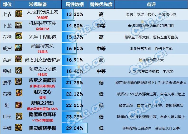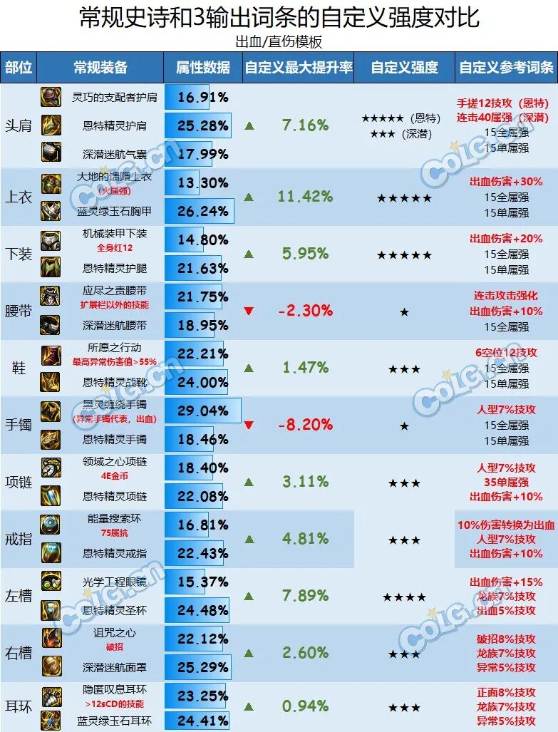 上衣和左槽的提升率是最大的,而且是相对不需要什么额外的操作的直接提升。头肩需要手搓获得高收益,裤子需要注重大技能的释放节奏以维持全程。戒指和项链部位的强度吃到了版本军团4小龙均为人型的福利,短期内比较强势。剩下的其他部位,即使是3条优秀的输出词条,也和同部位常规史诗数据上拉不开巨大的差距。替换需要缘分。(后续巴卡尼版本的史诗头肩与鞋子强度,相对于当前版本与自定义装备的差距会有所缩小)PS:对于传说装备,比如上衣,仅仅一条出血30%的价格就极为高昂了,4条都很优秀的词条自定义更是天价。而传说装备很难把经验变换到全部60级以上,相对而言也有不少攻击强化和技攻的亏损,性价比是很低的。还需要额外打造,打造完毕后,随着版本词条整体的上升,装备价值也会缩水,不能把词条转移出去这一点也决定了也没有好的回收利用手段。一般平民玩家笔者不建议去考虑。