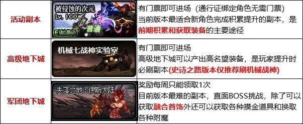 当前版本的高级副本分为高级地下城和军团地下城两种副本组成高级地下城中贵族机要和毁灭的寂静城由于史诗之路的存在,不推荐进行攻坚,仅推荐机械七战神实验室。军团地下城作为当前版本的最困难的副本,我们的目标就是达到3W3名望进军军团副本,不仅可以获得融合装备材料还能够凭借每周的军团地下城白嫖高词条装备自定义史诗和打造材料。
