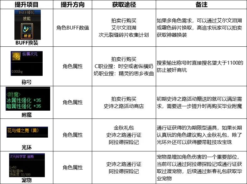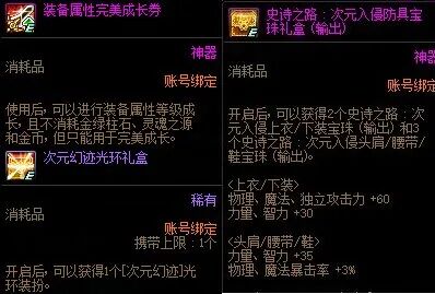 110级版本中我们需要不断对已有史诗装备进行喂养来提升已有史诗装备的词条来提升史诗装备的属性和名望,同装备等级越高伤害越高。100级版本的两大重要道具:金绿柱石和灵魂之源。【金绿柱石】金绿柱石是当前版本的重要道具。我们在进行词条成长,词条传送,词条转移,融合装备和装备跨界都会用到金绿柱石。还可以使用金绿柱石购买高级地下城的门票。【灵魂之源】除了跨界外,上述其余装备提升均需要灵魂之源配合金绿柱石进行。灵魂之源可以通过史诗灵魂1:1兑换或者从拍卖行获取。通过道具快速提升伤害如果是百级版本前的回归或新晋的小伙伴,仅有赠送的装备刷图前期或较为困难可以通过以下道具来快速提升伤害。快速提升伤害的重要道具举例: