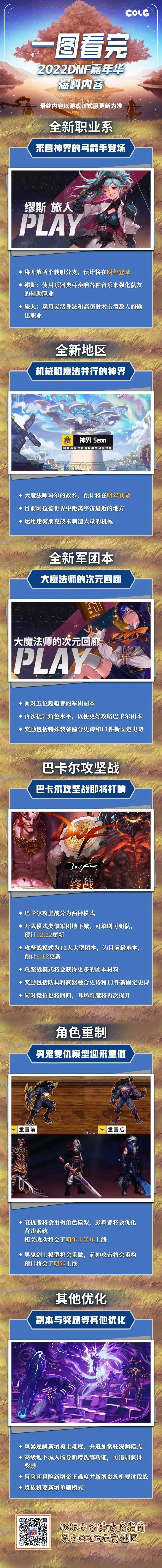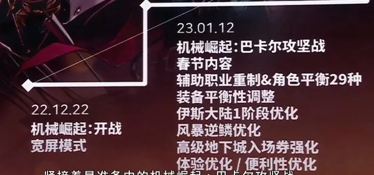 优化相关12月22日将会上线机械战神跳车功能装备推荐系统将会重做优化以及更多便利性功能优化将在未来上线装扮相关明年2月装扮上限扩张,装扮方面将会提高更多产能资源可能联动(奥特曼,罪恶装备)职业相关将会根据角色性能和本色提供更好的职业平衡,提高操作带来的回报在作战环境方面将会提供更多作战情况而非单纯追求爆发,破解机制或者正面刚都可以过关游戏装备相关装备改版相关将会整合更新减少理解负担并增加装备转移相关的奖励投放将会对部分难以达成条件的核心部件(如攻速鞋)进行优化,春节版本将会推出深渊玩法满足玩家的多元化成长需求拍卖行相关拍卖行技术底层存在上限,容易被黑产恶意利用,已使用多种措施但无法彻底解决目前人力资源集中在110版本的优化部分,预计将会通过多线程方式提升流畅性金币相关这次调整基于之前的投放上的失误,DNF经济系统较为开放,容易被黑产利用白图基于名望门槛有收益逐渐上升,但由于后期大部队的成长高于预期同时金币消耗低于预期所以需要进行调控,防止黑产的措施穿越更新重大玩法部分需要进行稳定性测试等原因穿越难度很大,但如打造,经济向相关调整是可以穿越更新,如完美属性成长等同时也要考虑版本稳定性的考虑中韩版本更新时间差异问题由于硬件环境,代码等原因不同,韩服内容需要经过稳定测试等环节来确保国服版本内容稳定运行对于部分有助提升游戏提升的非玩法向更新将会适当穿越